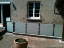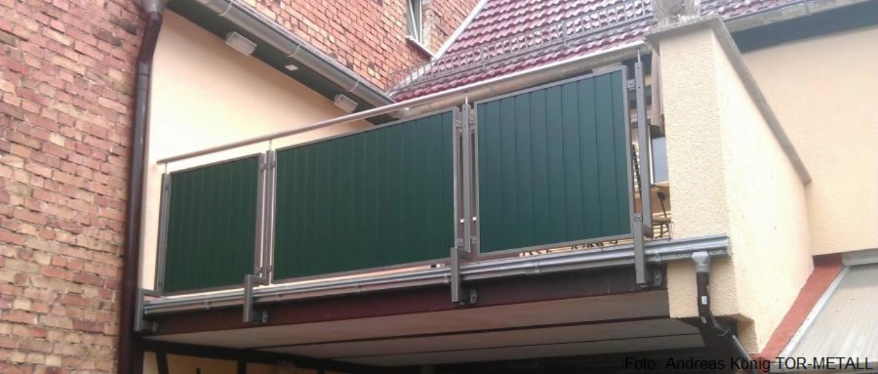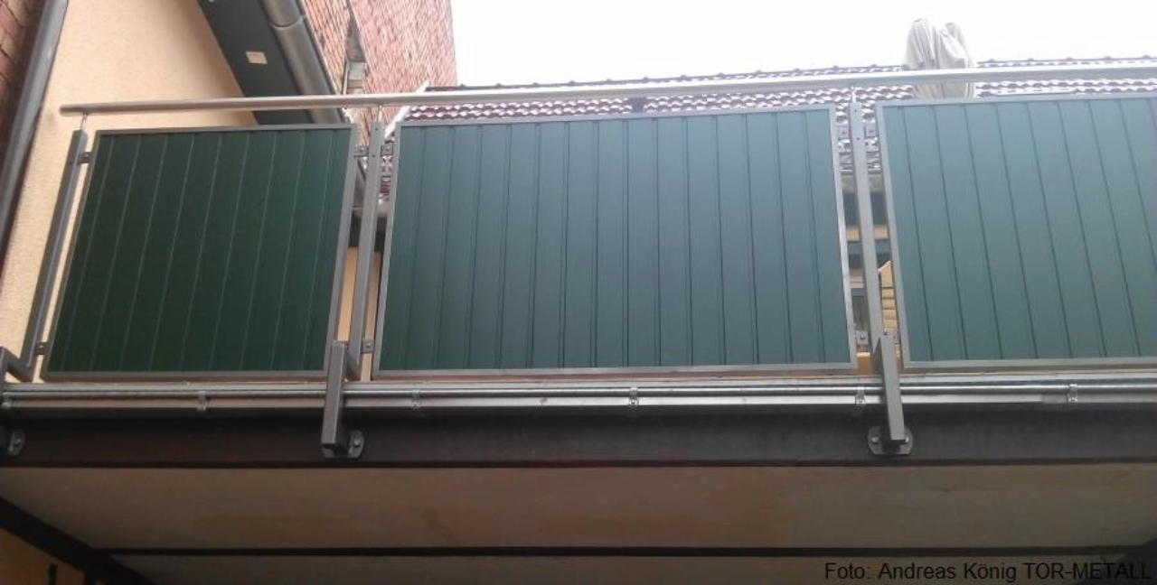 • 4 Pfosten aus Stahlquadratrohr 40x40x3 mm mit seitlicher Anschraubplatte zur Befestigung an Stahlträger• Pfosten im unteren Bereich zur Umbauung der vorhandenen Regenrinne gekantet• Pfosten oben mit Abdeckkappe geschlossen, Abdeckkappen mit Gewindebohrungen zur Aufnahme von Edelstahlhandlaufstiften• demontierbar gestalteter Edelstahlhandlauf aus Rundrohr d=42.2 mm, mit Edelstahlhalbrundkappen an beiden Enden geschlossen• Winkelrahmen Stahlwinkeln 42/20 mm, verschweißt, mit eingeschraubten Befestigungsvierkant zur Füllungsaufnahme, Rahmen demontierbar gestaltet• Füllungen mit Kömapan Nut- und Federprofilen (Holzimitat, Vollkunststoffprofile mit UV-beständer Oberflächenfolie mit Holzmaserung)• Stahlteile feuerverzinkt und beschichtet mit WS-Plast-Dickschicht• Edelstahlteile aus Edelstahl 1.4301/ Edelstahl 1.4305
