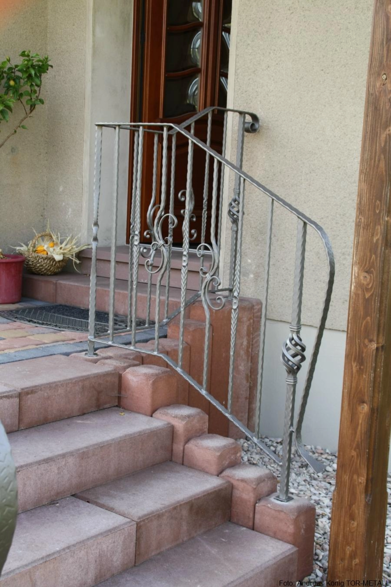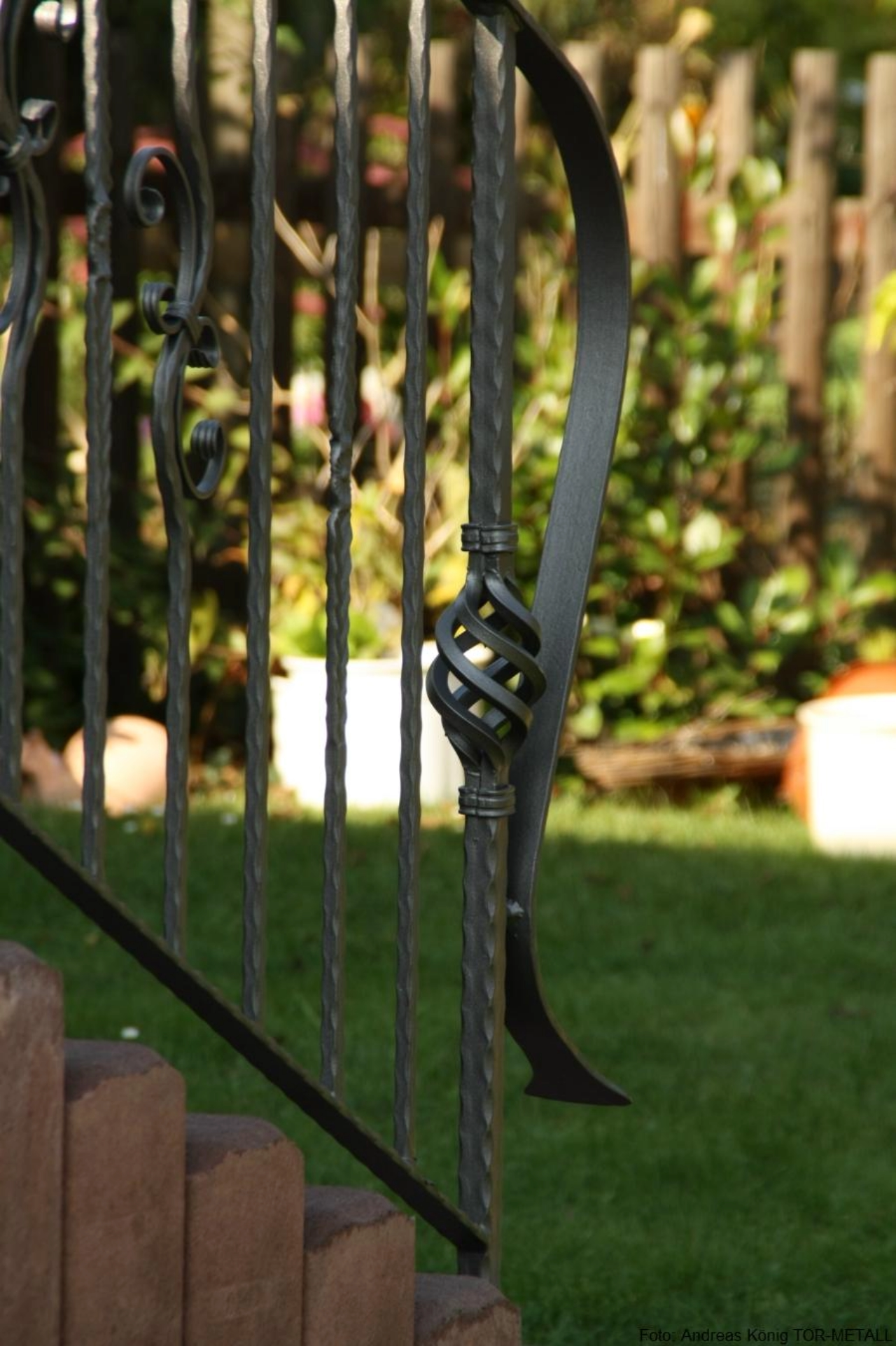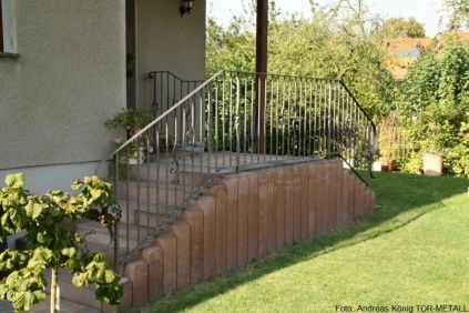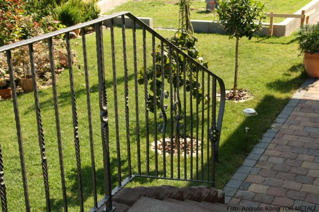 gartenseitig:• Geländeranfangsstäbe kantengehämmert, mit Zwirbel• Mittelpfosten auf Treppenpodest kantengehämmert, mit Fischgrätmuster• Füllung abwechselnd aus Vierkantstäben kantengehämmert und Vierkantstäben kantengehämmert mit Fischgrätmusterung• pro Feld links und rechts neben dem mittigen Stab je ein Stab mit C-Schnörkel, spiegelbildlich angeordnet• Untergurt aus Flachstahl, kantengehämmert• Handlauf aus kreuzschlaggehämmertem Flachstahl, am Anfang zum Anfangspfosten gerollt• Handlaufhöhe: 950 mm• Handlauflänge ca. 7,65 mhauseingangstürseitig:• zur Gartenseite stilgleiches Gegenstück, dem Aufgang zur Haustür angepaßt