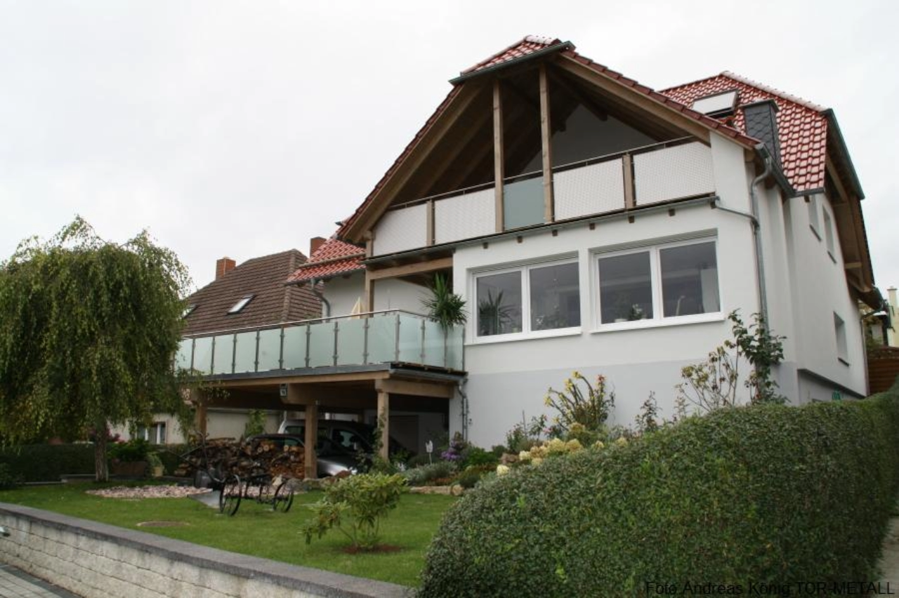Edelstahl-Terassengeländer mit Glasfüllung im 1.OG
