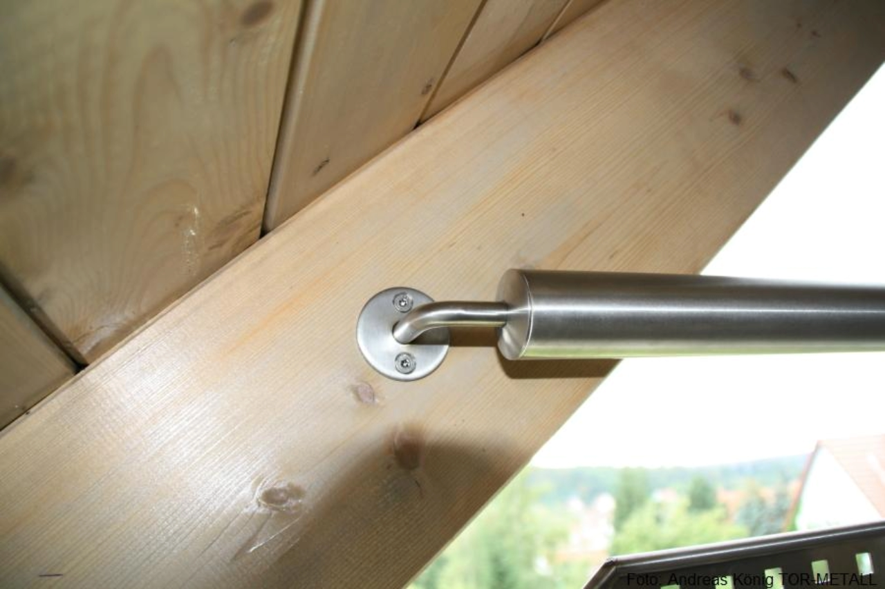 • Pfosten aus Stahl in Doppelschwertbauweise, feuerverzinkt und mit Eisenglimmer beschichtet, seitlich an den Treppenwangen montiert• Füllung mit Rundeisen d=12 mm, Pfostenbefestigung über Relinghalter• auf Pfosten aufgesetzter Edelstahlhandlauf nach innen gekröpft• Handlauflänge ca. 1,75 m