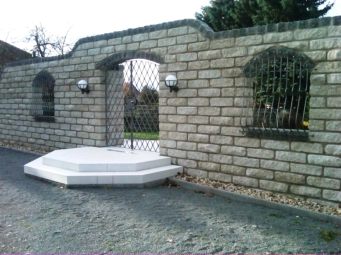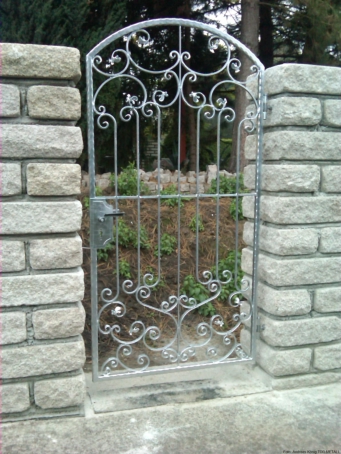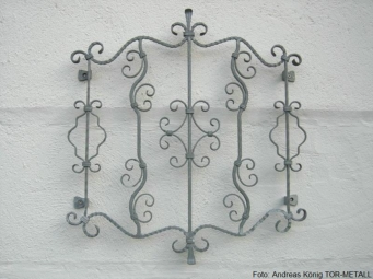 • zweiflügelige Rundbogentür B x H ca.: 1,91 x 2,65 m• Türflügel aus Flacheisen kantengehämmert• Füllung mit Zacken-Gitterstäben in Jägerzaunoptik• mit Schloß und Schloßblenden in beiden Flügeln, im Gangflügel Schloßblende für Profilzylinder gelocht• Standflügel mittels in den Boden einriegelnden Treibriegel• feuerverzinkt und mit WS-Plast-Dickschichtlack eisenglimmer beschichtet• zwei Stück Fenstergitter BxH ca.: 1,10 x 1,20 m• Fenstergitter mit Korbstäben für Blumenkästenunterbringung auf den Fensterbänken• Korbstäbe im oberen Bereich mit beidseitigen C-Bögen sowie im oberen und unteren Bereich beidseitig gerollt• wie Tür feuerverzinkt und mit WS-Plast-Dickschichtlack eisenglimmer beschichtet