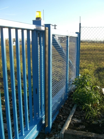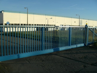 • Schiebetor mit Rechteckrohr-Füllung 30/20 mm, feuerverzinkt und mit Plast-Dickschichtlackierung• mit Alu-Leisten beidseitig des Oberholmes als Verschleiß- und Farbschutz• seitlicher Zaunanschluß im Torabstellbereich (sicherheitsbedingter Eingreifschutz in bewegtes Tor)• impulsgesteuerte Schiebetorantrieb in der Torführungssäule• lichte Tor-Durchfahrtsbreite x Torhöhe: 6,2 x 1,5 m