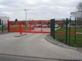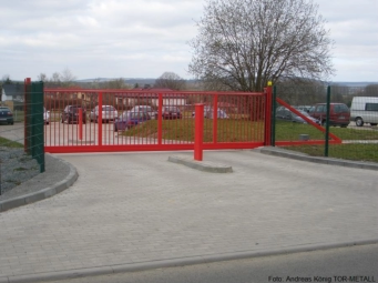 • feuerverzinktes und farbbeschichtetes Schiebetor mit Stabfüllung 30/20 mm• impulsgesteuerter Schiebetorantrieb• Ansteuerung über ein Codekartenlesegerät in separater vorgesetzter Steuersäule• lichte Tor-Durchfahrtsbreite x Torhöhe: 7,00 x 1,83 m