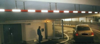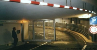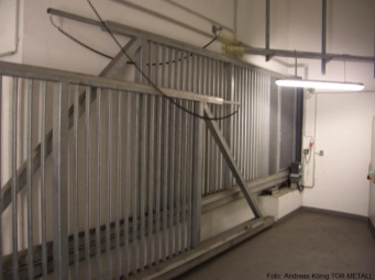 • da im Außenbereich keine Abstellmöglichkeit für die geöffneten Schiebetore vorhanden ist wurden diese in den Spindelinnenraum zwischen Parkdeckauffahrt und Parkdeckabfahrt integriert• Sicherheitseinrichtungen verhindern bei Toröffnung den Einzug von Personen in die Parkhauswand• aufgrund der Nachtschließung des Parkhauses wurden die Tore mit Notausgängen in Form von Schlupftüren ausgestattet, die wiederum elektrisch mit dem Antrieb verriegeln, sodaß eine Torbedienung bei Schlupftüröffnung verhindert wird• Anlagen mit Zusatzsteuerung für tageszeitabhängigen Zulauf• Zulaufsteuerung so konzipiert, daß im Nachtbetrieb wahlweise über automatischen Zeitablauf oder über potentialfreien Impulskontakt (von Schrankenanlage kommend) die Torschließung erfolgen kann• mit Möglichkeit einer Torzustandsmeldung (Auf /Zu) an Zentrale der City-Galerie über potentialfreie Kontakte• zusätzlich zum Publikumsverkehrschutz mußte ein Personalschutz an der Zugangstür zum Spindelinnenraum verbaut werden (elektr. Sicherheitselemente), da die Tür zum Spindelinnenraum am Ausfahrtstor liegt• beide Schiebetore antriebsbetätigt• lichte Tor-Durchfahrtsbreite x Torhöhe: 6,0 x 2,2 m (inkl. ca. 1,2 m Schlupftürbreite)