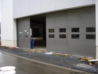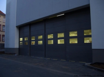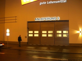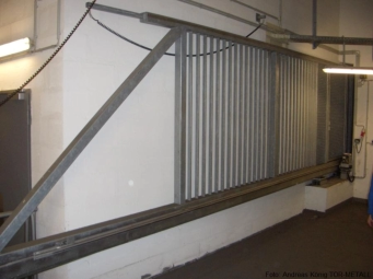 • in Ermangelung ausreichender Platzverhältnisse für normale Schiebetore im Abstellbereich wurden die ingesamt 3 Anlagen der City-Galerie von uns als mehrteilige teleskopartig funktionierende Schiebetore konstruiert, gefertigt und montiert• Füllung mit Sandwichpaneelen (doppelwandige mit PU-Schaum gefüllte Stahlpaneele) und Kunststoffverglasungen, außenseitig in Wunschfarben lackiert• alle Schiebetore antriebsbetätigt durch konstruktive Eigenlösung• großes 2-flügeliges Teleskopschiebetor Breite x Höhe: 12,0 x 4,2 m