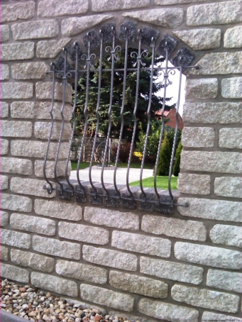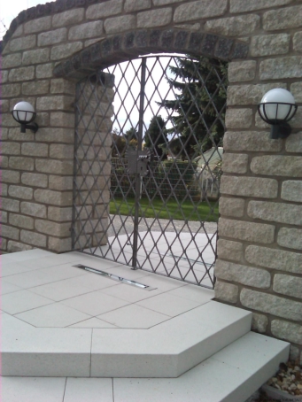 • zweiflügelige Rundbogentür B x H ca.: 1,91 x 2,65 m• Türflügel aus Flacheisen kantengehämmert• Füllung mit Zacken-Gitterstäben in Jägerzaunoptik• mit Schloß und Schloßblenden in beiden Flügeln, im Gangflügel Schloßblende für Profilzylinder gelocht• Standflügel mittels in den Boden einriegelnden Treibriegel• feuerverzinkt und mit WS-Plast-Dickschichtlack eisenglimmer beschichtet• zwei Stück Fenstergitter BxH ca.: 1,10 x 1,20 m• Fenstergitter mit Korbstäben für Blumenkästenunterbringung auf den Fensterbänken• Korbstäbe im oberen Bereich mit beidseitigen C-Bögen sowie im oberen und unteren Bereich beidseitig gerollt• wie Tür feuerverzinkt und mit WS-Plast-Dickschichtlack eisenglimmer beschichtet